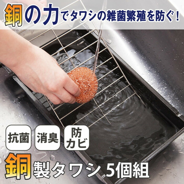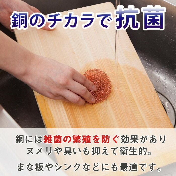 | 銅の力で汚れをすっきり!銅製タワシ5個組。純銅には雑菌の繁殖を防ぎ、ヌメリや臭いを抑える効果があります。そのため、まな板やシンクのお手入れ、また、お鍋やコンロ、グリルなどのしつこい汚れや焦付きもすっきり落とせます!そして使用後は、銅製タワシ自体も水洗いすれば、いやな臭いやヌメリを防ぐことができます。 |