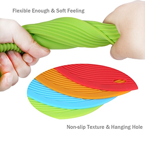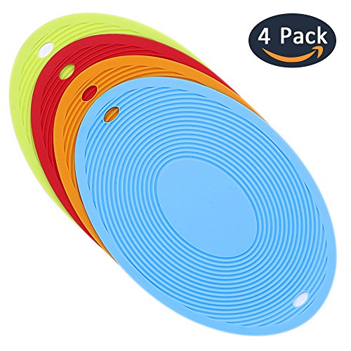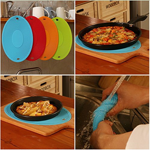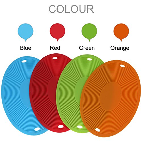 - ★PACKAGE INCLUDE: A set of 4 pcs silicone pads of Blue, Orange, Red, Green. Size: 12inch x 8inch.SAFETY NOTE: We hope you enjoy using the mats in proper use. We suggest NOT use them for oven for it is mat not gloves, the unprotected part of hands are in big burn danger if you use them to take something out of an oven.