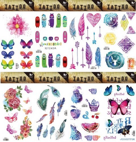 -. Feature : Extremely realistic temporary tattoos that look exactly like a real tattoos.\r\n / These temporary tattoos are 100% waterproof and long lasting...for up to 5 days, even while swimming & bathing.\r\n / Precut tattoos dab on with water in seconds, brush with your skin-toned face powder to set.\r\n / Temporary Tattoos are very easy to apply in just 10 seconds with water, they are also easy to remove with rubbing alcohol\r\n / Temporary Tattoos will also apply to almost any surface: clothing, mirrors, cups, glasses and more\r\n