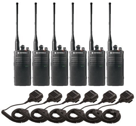6 Pack of Motorola RDU4100 two-way radios with speaker mics. The speaker mics make communication more mobile and even louder. Each of our radios comes complete with factory default programming, a single-unit charger, 18.5 hour lithium ion battery and belt clip.Feature