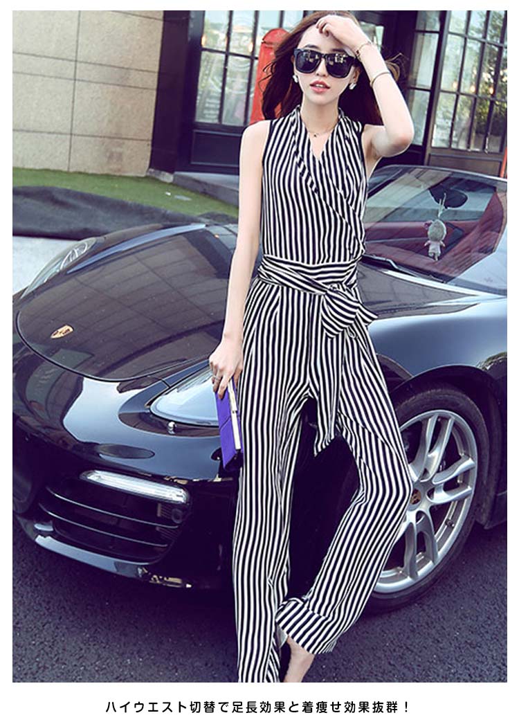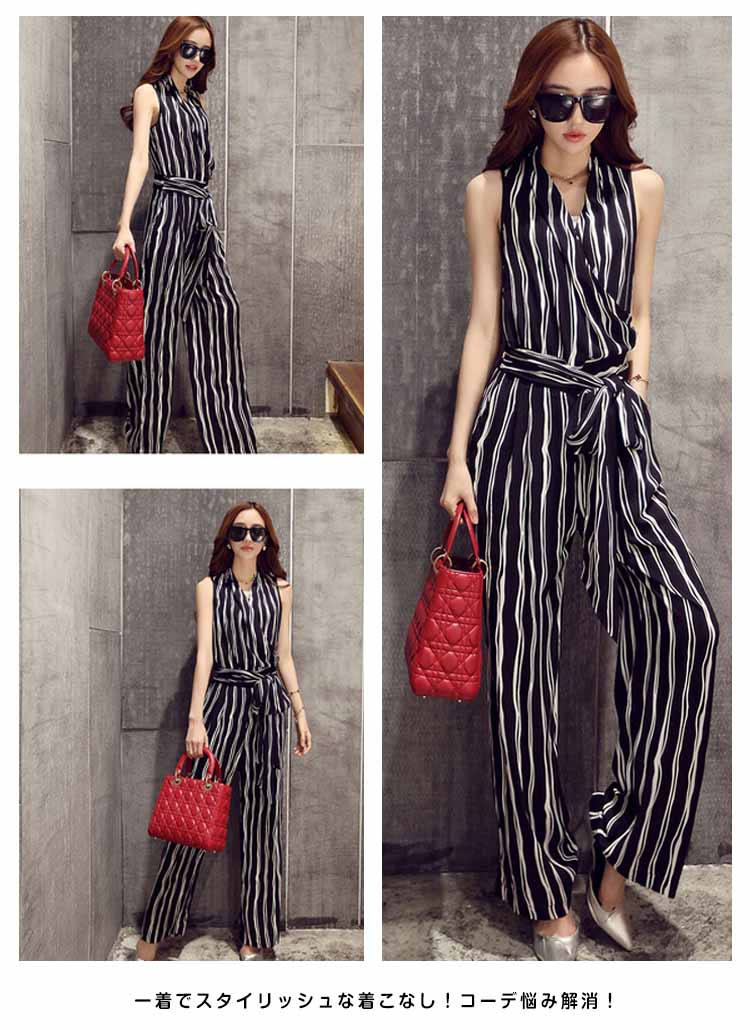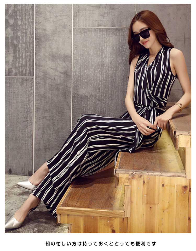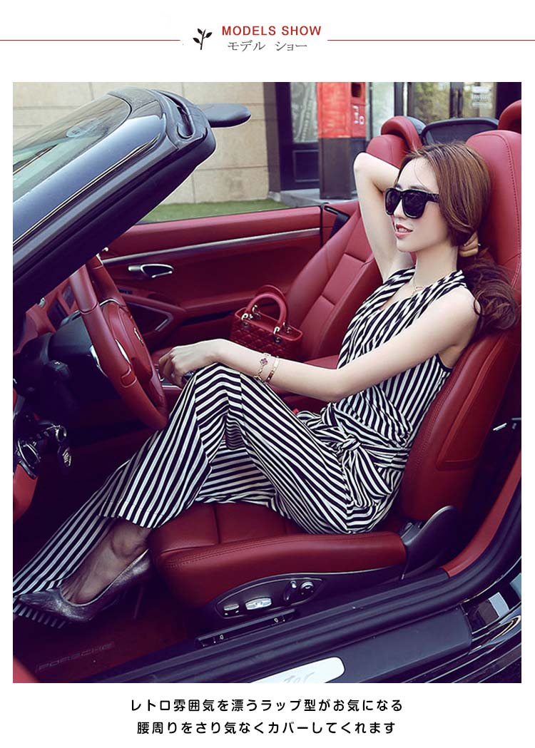 | 縦ラインを強調するストライプオールインワンレトロ雰囲気を漂うラップ型がお気になる腰周りをさり気なくカバーしてくれますハイウエスト切替で足長効果と着痩せ効果抜群!ウェストリボンはアクセントに◎一着でスタイリッシュな着こなし!コーデ悩み解消!朝の忙しい方は持っておくととっても便利です | |