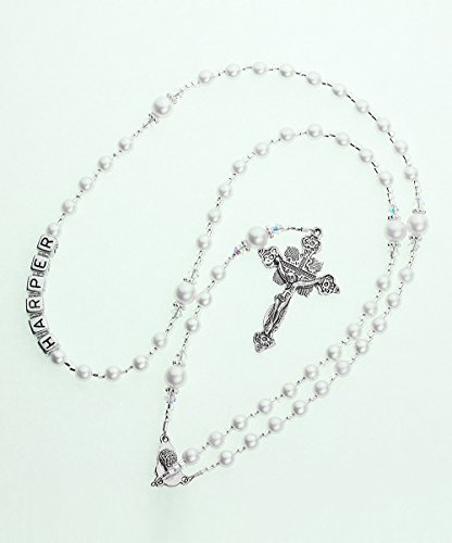 -. Feature : TOP QUALITY - All Components and findings are Silver, Rosaries are hand crafted by a Brooklyn Mom. Rosary is around 25 inches long, so it will fit over the head. Made of Swarovski simulated pearls, silver plated acrylic letters and Italian Silver Cross, manufactured in the USA. / FUNCTIONAL - Rosary can fit from a newborn til the adults. It will fit easy over the child's head. / SAFETY AND SERVICE - Product complies with CPSIA/CPSC requirements, and meets the safety standards for children's products. Components are free of BPA, PVC, phthalates and lead. / CARE AND GIFT - Our Rosaries are Easy to clean: simply use wipes or a damp cloth. They are securely packaged in Organza Rosary Pouch and they are ready to be presented as a baby gift. / MODERN DESIGN - stylish unisex patterns, Modern and neutral colors for both boys and girls. Inspired by European design to be on the forefront on fashion and style.