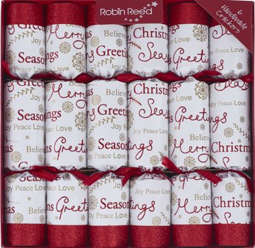 - 12 Seasons Greetings Red and White Christmas Crackers.