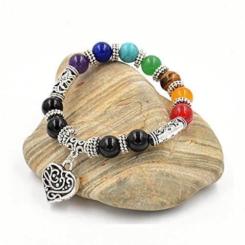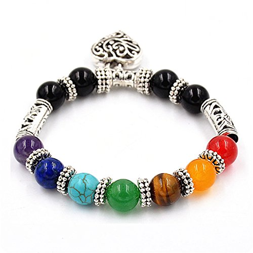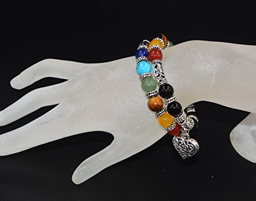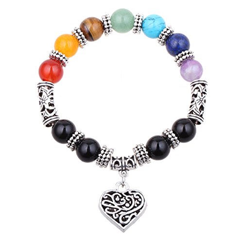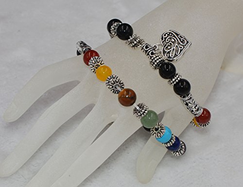 MIKINI Set of 2 Bracelets - 7 Chakra Stones Bracelet with Silver Heart Charm for Women, 10mm (Pack of 2)