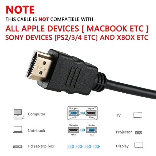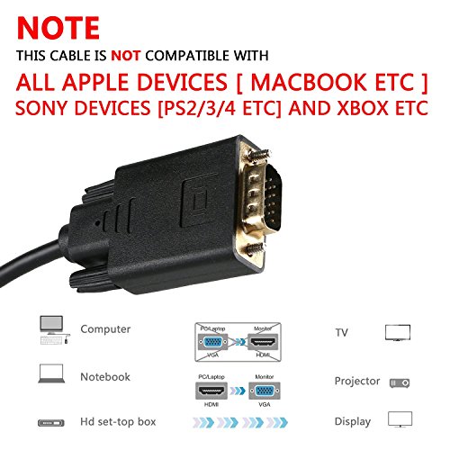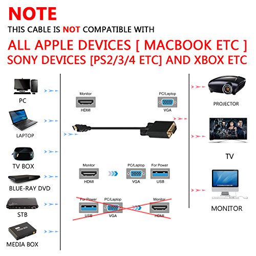 ✔ NOTE - This cable is NOT compatible with all Apple devices [ Macbook Etc], Sony Devices [PS2/3/4 Etc] and Xbox Etc; This is not a bi-directional adapter cable, can not go from VGA to HDMI so you won’ t be able to use this in reverse.