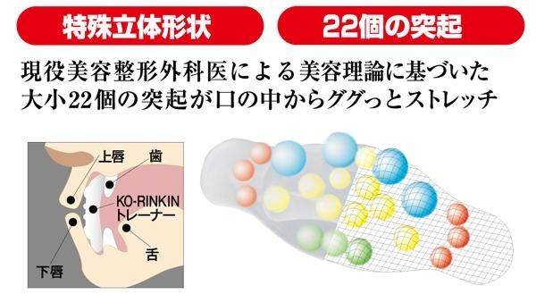 美容整形外科医が考案。立体形状のマウスピースが表情筋の要、口輪筋に内側からアプローチ! 製造国:日本 素材・材質:スチレン系エラストマー 商品サイズ:約32×90×21mm 重量:約7g ※サプライヤー直送品 ご注文後2~3営業日後の出荷となります【商品名】KO-RINKINトレーナー