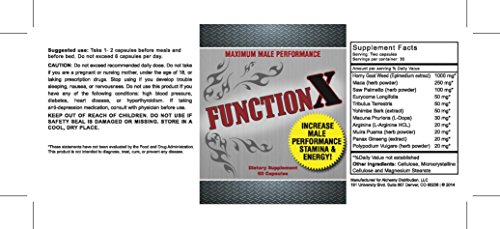 Studio : Alchemy Distribution Publisher : Alchemy Distribution Binding : Health and Beauty Product Description Function X is a powerful combination of herbal extracts and amino acids which can increase male libido and performance almost immediately. Unlike our competitors, Function X uses only 10:1 and 50:1 herbal extracts, not raw herbs. The difference is noticeable. With extracts you get the pure, concentrated essence of the herb, not filler. A 10:1 extract means that 10 pounds of raw herb powder is concentrated into 1 pound of pure energy. Feel the difference. Function X offers benefits to men with all kinds of life styles. Whether you are highly sexually active, involved in athletics, or just want to bring maximum drive and energy to your daily life, Function X is for you. 0