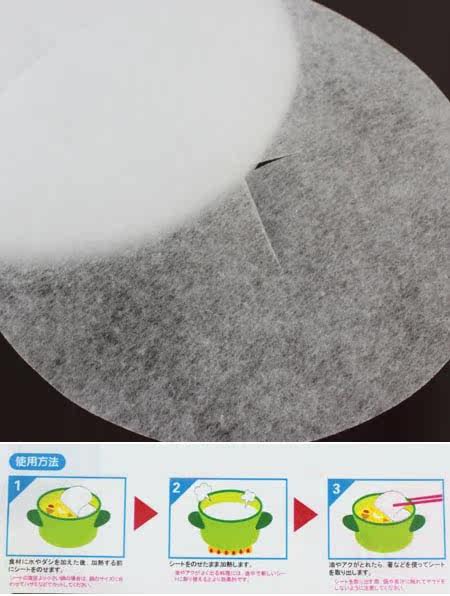 Used to absorb excess oil and impurities floating? before cooking in the pan and cook together into a piece of oil-absorbing film? the use of special materials can be a long and absorbing film opening in the middle of the cross in the cooking time to prevent floating. Replace the lid can also be used to replace a half better. Prevent excessive intake of fat? make your life more healthy.