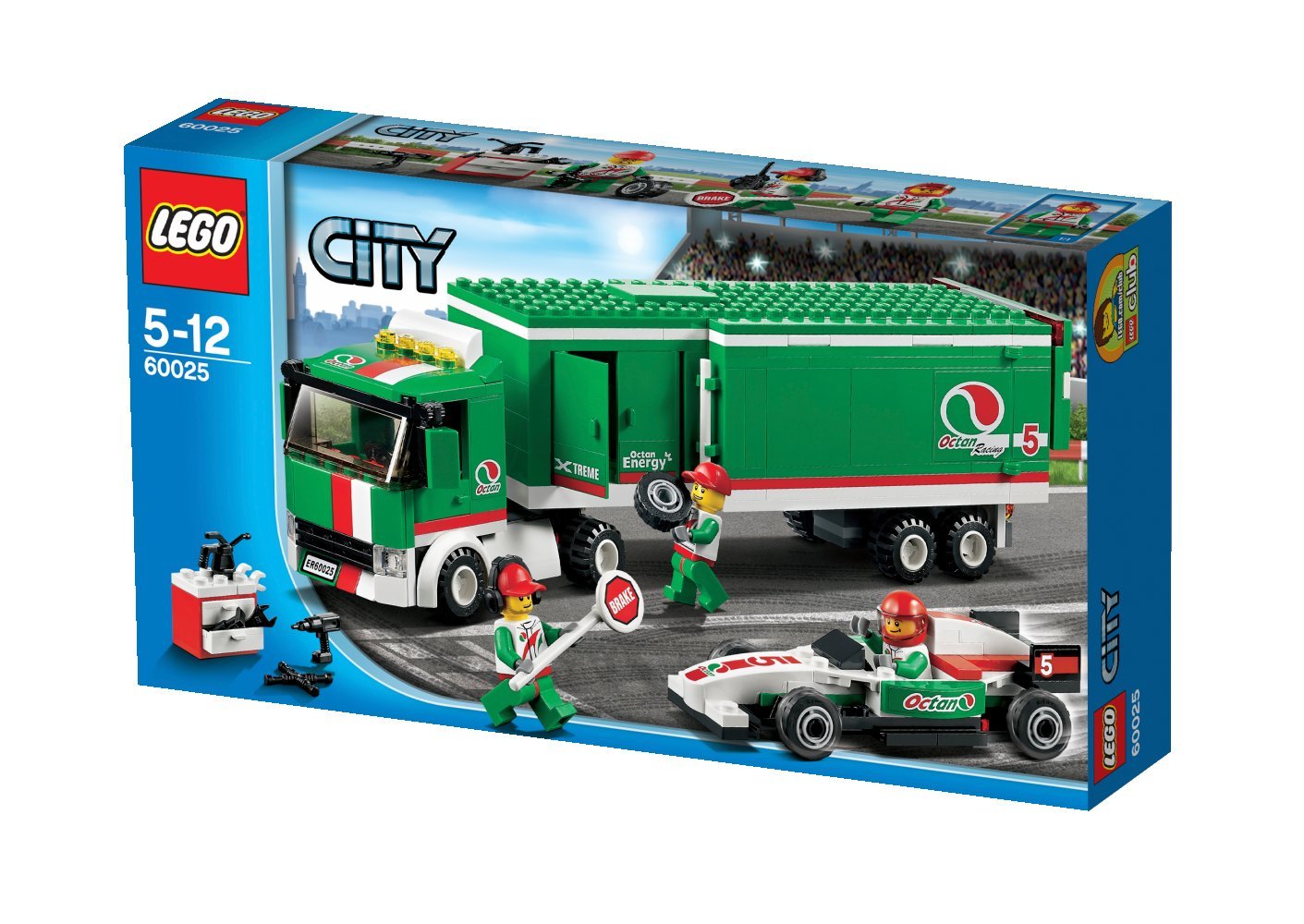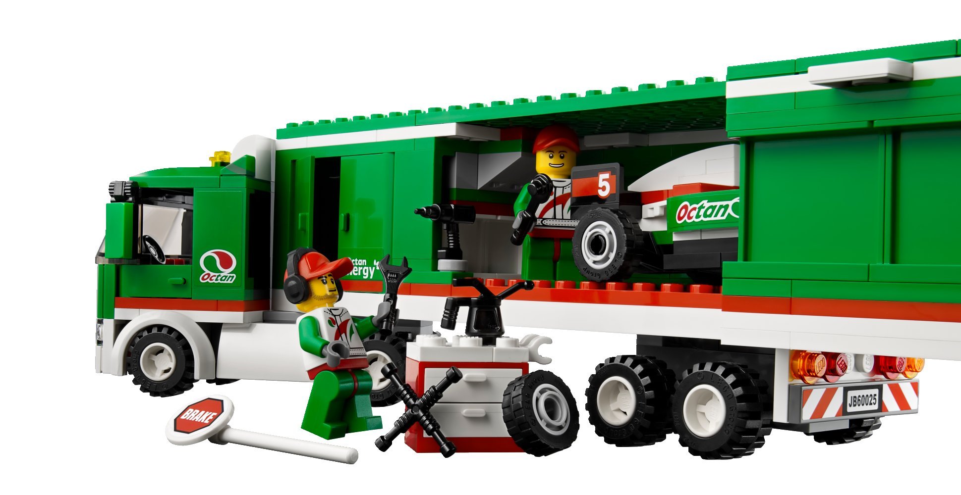 Let's ride the ultra high-speed race car from the back of the Grand Prix truck and join in the race There are also pit courts crossing the tires! There are three mini figures and tools, a tool box, a sign, a transceiver, a spare wheel etc. such as race drivers, pit crew etc.