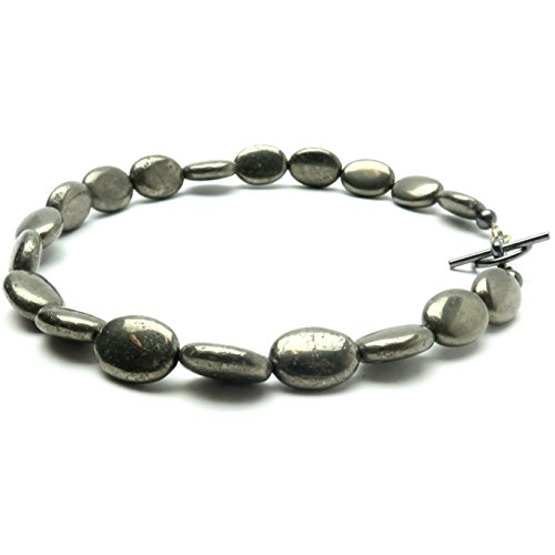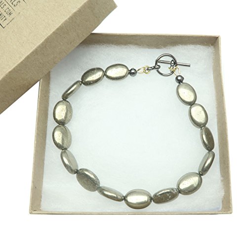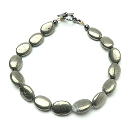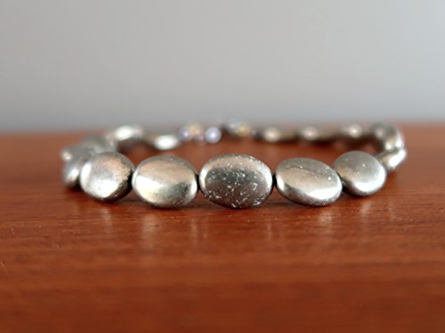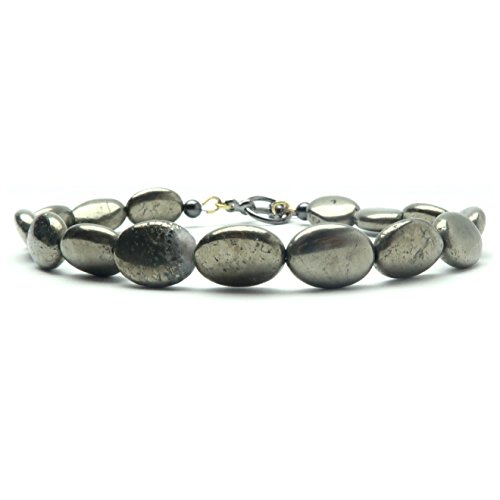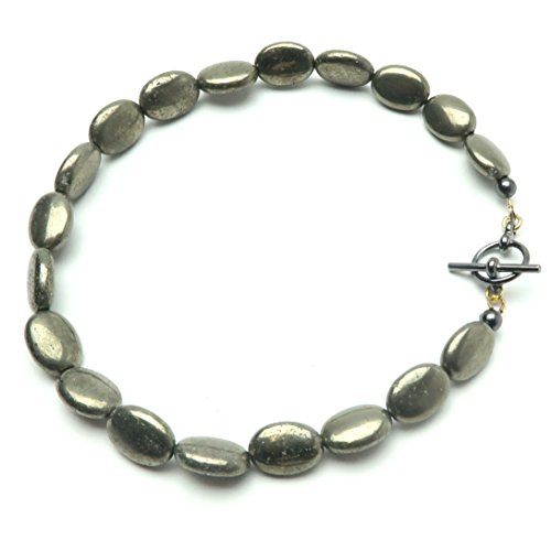 Handmade in California: Natural Pyrite ovals are strung on your new crystal healing anklet. Pyrite is popularly known as Fools Gold for its golden metallic color. These metallic stones are polished into oval beads and strung on anklets secured with gunmetal toggle clasps.