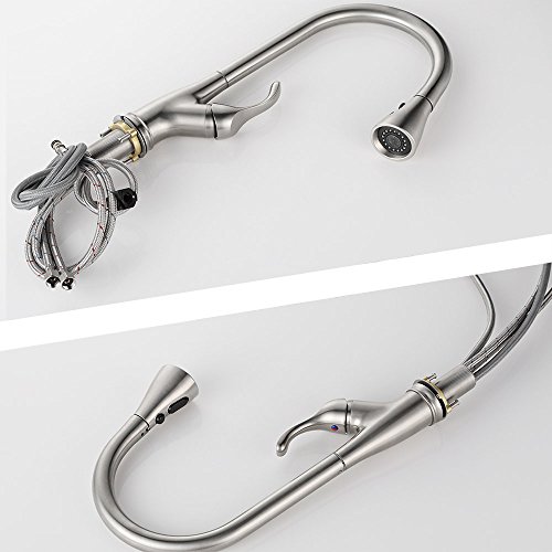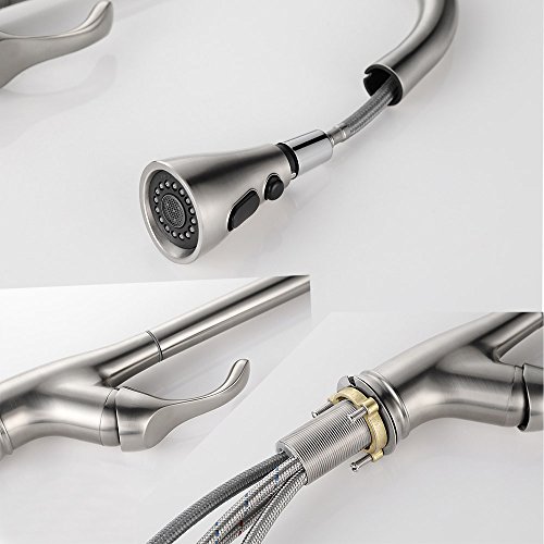 - Easy to Operate & Maintenance. Single handle pull down kitchen faucet design integrate to control water temperature and flow volume easily,high arc 360 degree swivel spout supply full range washing access,updated mechanical retraction system make pull down sprayer head always sit into original place after use. Superior corrosion & rust-resistant finish prevent dirty from sticking to faucet surface, clean faucet by cloth is enough in daily use.