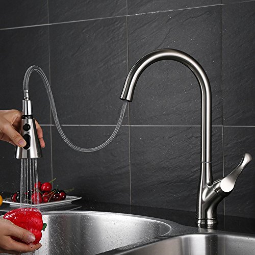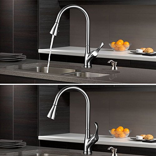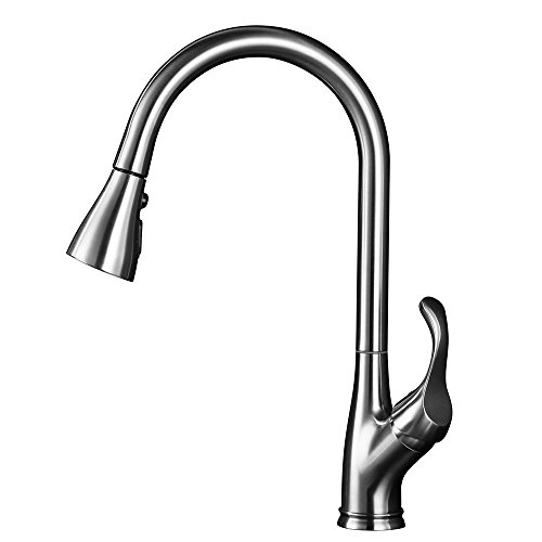 - Popular Design. High arc pull down sprayer kitchen faucet design make your kitchen simple and fresh, good choice to replace your old sink faucet.