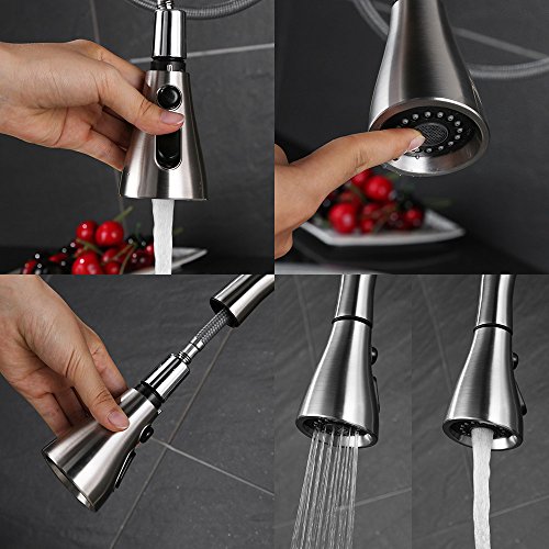 - Kitchen Faucet with Dual function Pull down Sprayer. Dual spray modes: STREAM,SPRAY. Use button on spout to toggle between spray and stream,the spray head features specially sngled nozzles that form a wide, powerful blade of water to sweep your dishes and sink clean.