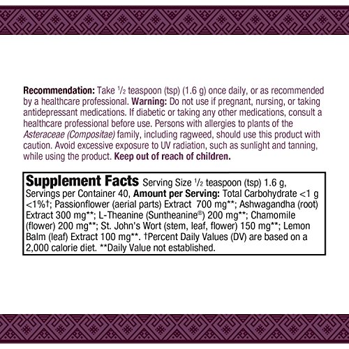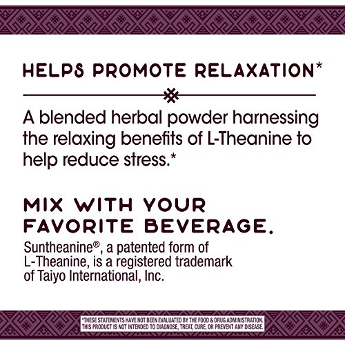 -. Feature : SUPPORTS RELAXATION: A blended herbal powder harnessing the relaxing benefits of L-theanine to help reduce stress. / PREMIUM HERBAL BLEND POWDER: Blend of L-theanine, lemon balm, ashwagandha, St. John's Wort, passion flower, and chamomile / Try mixing with your favorite beverage / GLUTEN FREE. No sugar, salt, yeast, wheat, soy, dairy products, artificial colors, flavors or preservatives / These statements have not been evaluated by the Food & Drug Administration. This product is not intended to diagnose, treat, cure, or prevent any disease