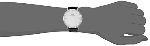 This classic Daniel Wellington Sheffield 0608DW analog quartz watch features an egg shell white dial with a silver case and black leather band.Feature