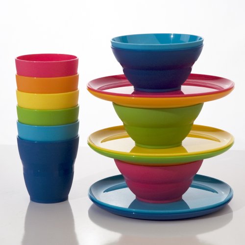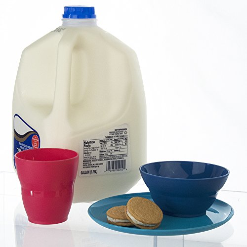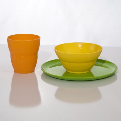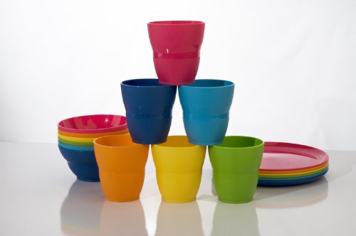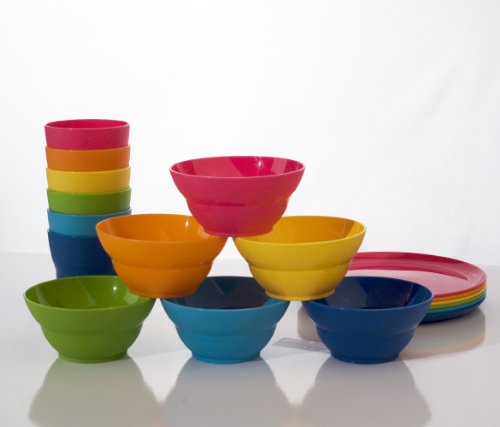 -. Feature : Set of 18 break-resistant plastic kids cup tumblers, bowls, and plates in assorted colors. / Made of break-resistant BPA-free polypropylene material. / Great for patio, poolside, and other outdoor use. / Top rack dishwasher safe. / CUP DIMENSIONS: 7oz., 3-1/2"H x 3" mouth diameter BOWL DIMENSIONS: 8oz., 2"H PLATE DIMENSIONS: 7"Diameter