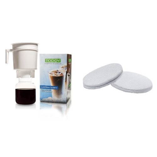 "(The Toddy) is the ultimate coffee maker." -The Washington Post Now you can create a 'coffeehouse' coffee - served steaming hot or iced cold, and in the comfort of your home - for much less than expensive signature coffee drinks! As important as those fresh roasted beans are to your cup of coffee, it's what you do with them that counts the most. In 1964, as a chemical engineering graduate of Cornell, Todd Simpson developed and patented a cold brew system that, using regular coffee beans, creates a superior-tasting cup of steaming HOT coffee. And, with 67% LESS ACID than coffee made by conventional hot brew methods, it's easier on sensitive stomachs. The Toddy coffee maker extracts the coffee bean's true delicious flavor and eliminates much of the acidity, producing a bold, super-smooth coffee that can be served one cup at a time. The Toddy brewer is also ideal for making tea - served hot or over ice. What's in the box: Brewing Container with Handle, Glass Decanter with Lid, Reusable Filters (2), Rubber Stopper (1), Instructions & Recipe Guide.Feature