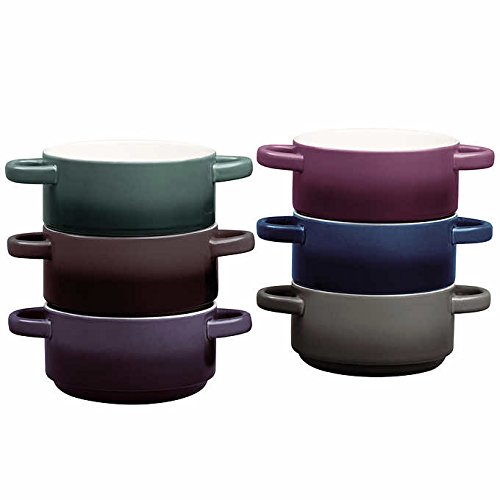 6-Piece Stackable, Dishwasher Safe, Microwave Safe, Durable Stoneware, Ombre Bowl Set Gourmet Basics by Mikasa features Two Convenient Non-Heating Handles. This set of 6 Ombre Double Handle Soup Bowls make heating and enjoying a bowl of soup simple and easy. Each bowl in the set is crafted from durable stoneware, and features two convenient handles on either side of the bowl. The handles provide a useful way to securely grip and carry the bowl when full. Also, the handles do not get hot when heating in a microwave, making it comfortable and easy to transport the bowl to the table. The bowls stack neatly when not in use to maximize storage space and keep the set organized.Feature