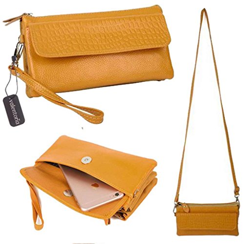 A clutch size purse made from Coated Leather(exterior) and PU leather(interior).3 compartments with a wrist strap and a shoulder chain for multipurpose carry.