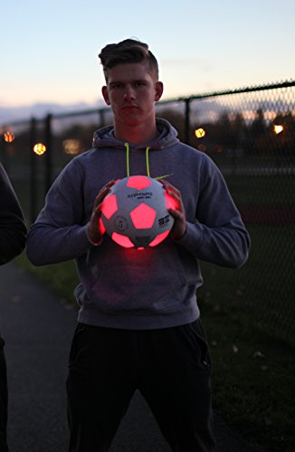 -. Feature : 2 Ultra-Bright LED Lights Glow Brilliant / Tough and Red Construction / Official Size & Weight / Light Shuts Off Automatically When Not In Use / Best Glow Soccer Ball Value on the Market Batteries Included