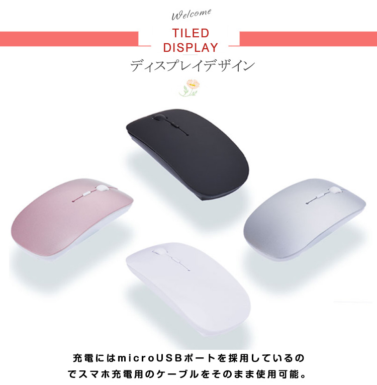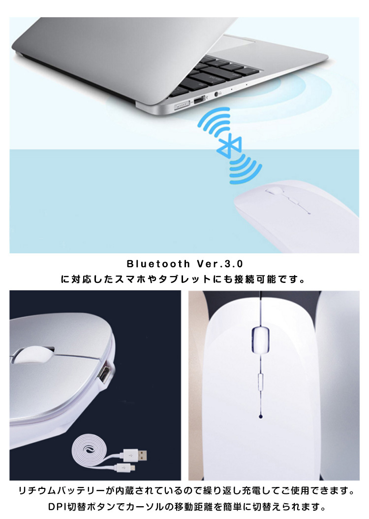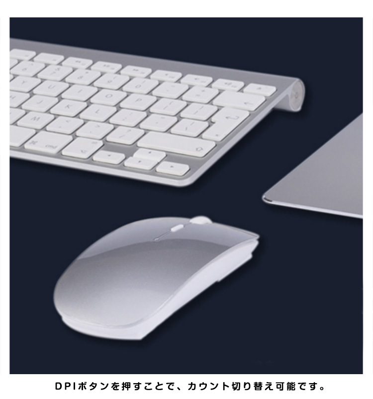 | 充電して繰り返し使えるワイヤレスマウス。充電にはmicroUSBポートを採用しているのでスマホ充電用のケーブルをそのまま使用可能。コンパクトサイズなので携帯性アップ。DPIボタンを押すことで、カウント切り替え可能です。 | |