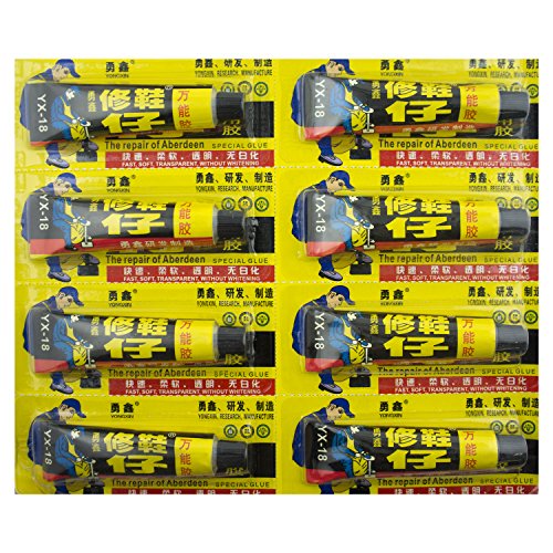Product Description A tube of YX-18 general shoe repair adhesive glue. Fast-setting and transparent, without whitening. Compliant with EU ROHS. Suitable for a wide range of household and office tasks, DIY and repairs. 0