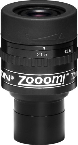 Studio : Orion Publisher : Orion Binding : Electronics Product Description This affordable telescope eyepiece offers versatile viewing options for skywatchers of all levels. The focal length varies from 7.2mm to 21.mm with markings of 7.2mm, 10mm, 13.5mm, and 21.5mm. The Zooom eyepiece's design consists of 7 lens elements in 4 groups and features fully multi-coated optics for clear, crisp images, a 40-degree field of view at 21.5mm, 60-degree field of view at 7.2mm and a comfortable 15mm eye relief, barrel threaded for Orion 1.25" filters. 0