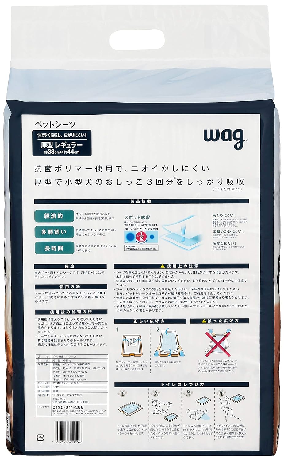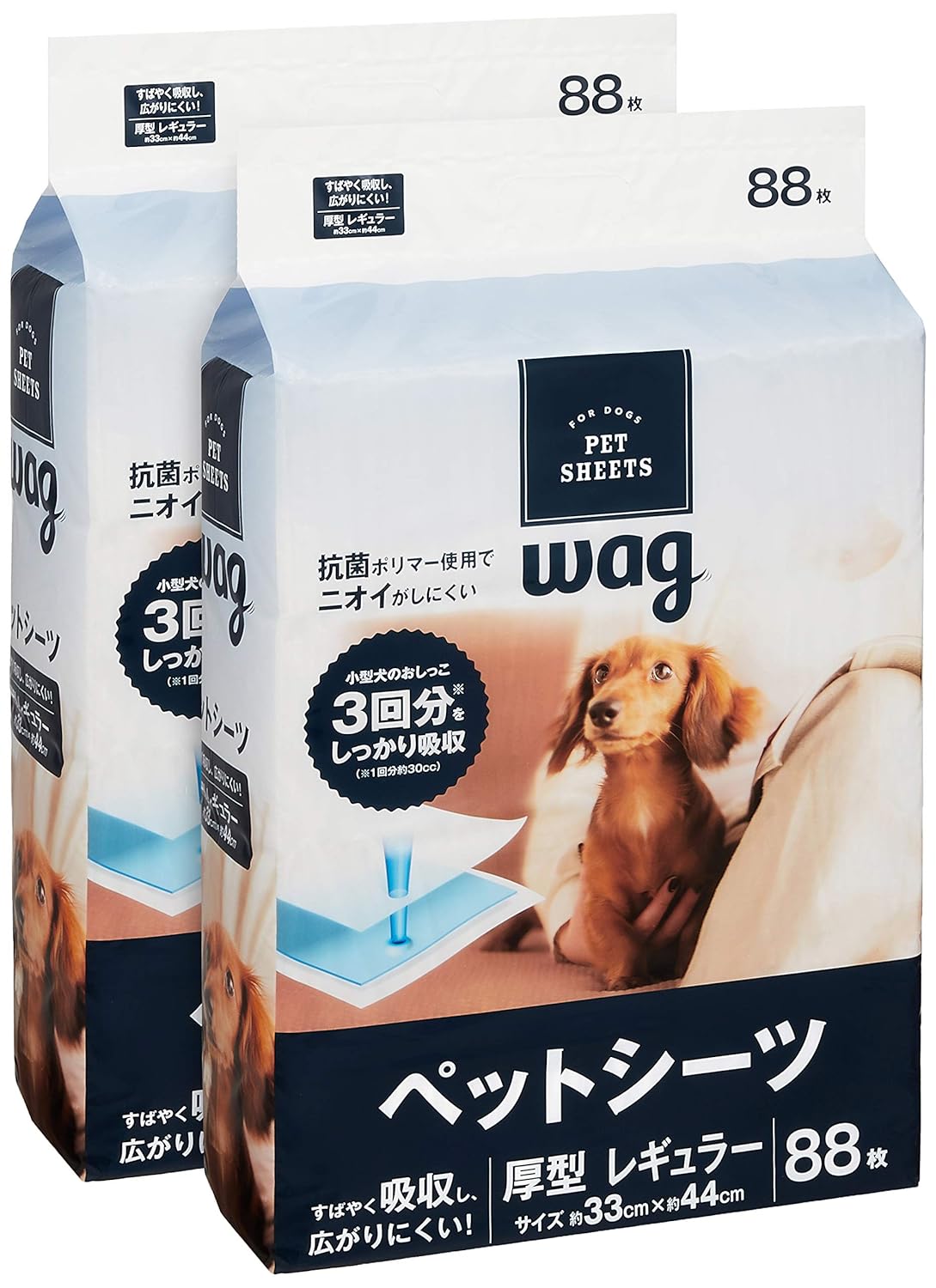 厚型 レギュラー88枚x2袋(176枚) 小型犬のおしっこ3回分を吸収(※小型犬のおしっこ1回分約30cc) 原産国:中国 サイズ (1枚あたり幅X奥行) :33×44cm 重量(1枚あたり):約29g サイズ(1袋あたり:幅X奥行X高さ):31×14×43cm 重量(1袋あたり):2.76kg