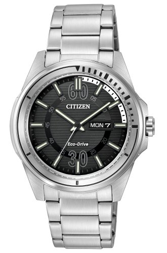 -. Feature : Stainless steel watch fueled by light-powered Eco-Drive and featuring matte black dial with day/date window / 42 mm stainless steel case with mineral dial window / Japanese quartz movement with analog display / Stainless steel bracelet with fold-over clasp and single-push-button safety / Water resistant to 100 m (330 ft)