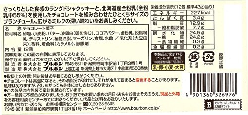 原材料:砂糖、小麦粉、バター、液卵白(卵を含む)、ココアバター、全粉乳、脱脂粉乳、デキストリン、植物油脂、マーガリン、食塩、水飴 / 乳化剤(大豆由来)、香料、着色料(カラメル)、膨脹剤