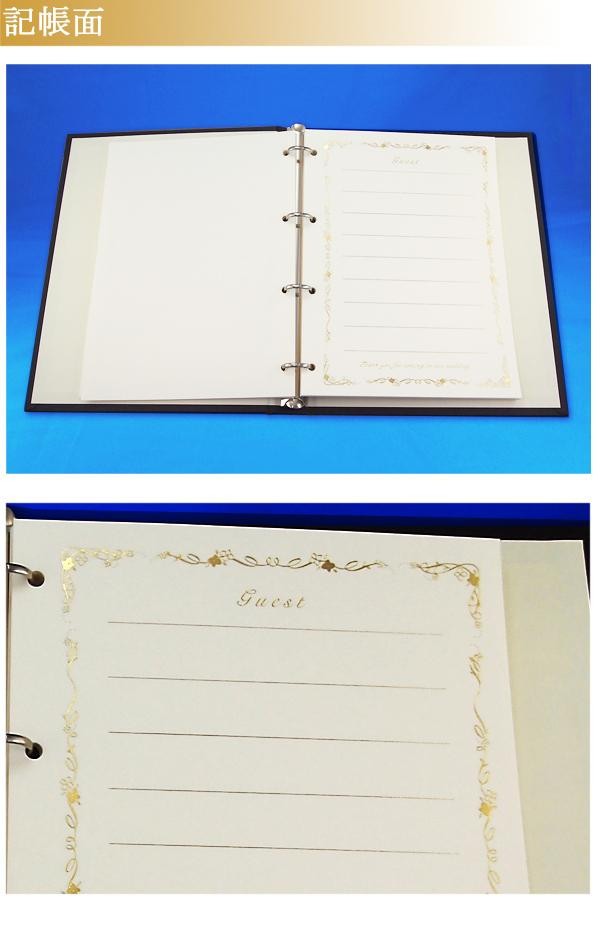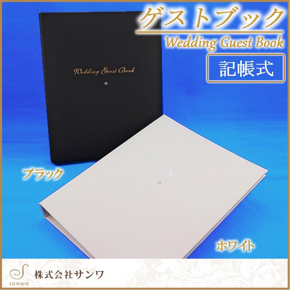 受付で記帳していただくスタイルのゲストブックです。箔押しされた華やかなレザー風カバーにスワロフスキークリスタルがアクセントとして取り付けられています。お色はブラックとホワイトの2色をご用意しています。 |