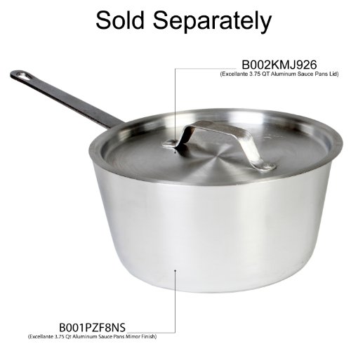 3.75 Quart aluminum sauce pan with mirror finish. 3 mm thick aluminum commercial grade. NSF listed. Dent resistant. Flat bottom for even heat distribution. Lid sold separately. Item # ALSKSS103Feature