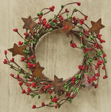 Red & Green Pip Berry Ring Mini Wreath With Rusty Stars Country Primitive Christmas Holiday Decor