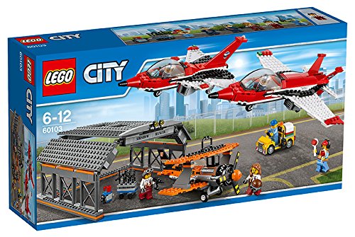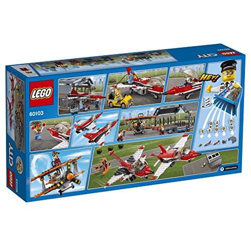-. Feature : Includes 6 minifigures: male and female jet pilots, male and female stunt pilots, a mechanic and an airport worker. / Features a hangar big enough to hold a plane, a gasoline barrel with roll-out hose, old-fashioned plane with turning propeller and 2 jets with opening cockpits. / Also includes an airport service car and tool wagon. / Accessory elements include a tool rack with tools, a mug, walkie-talkie and 2 paddles. / Roll out the hose on the gasoline barrel to fuel up the planes.