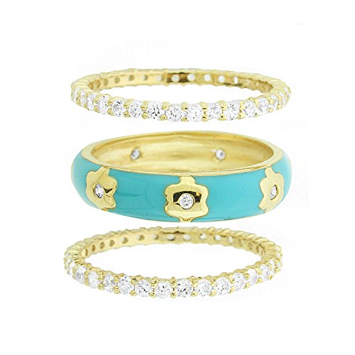 -. Binding : Jewelry -. Brand : Splendor Jewelry -. Department : womens -. Feature : Three Sterling Silver and Cubic Zirconia Stacking All-Around Bands / 3 stackable rings - Center band is 5mm thick, two surrounding bands are 2mm thick / Comes with a Free, Beautiful and Unique Jewelry Box ready for Gift Giving / Perfect GIFT for Birthdays / Nickel Free and Crafted in 925 Sterling Silver -. ProductGroup : Jewelry -. ProductTypeName : FASHIONRING -. Title : Gold Plated Sterling Silver Turquoise Enamel Center Band and Cubic Zirconia All-around Stacking Band Rings
