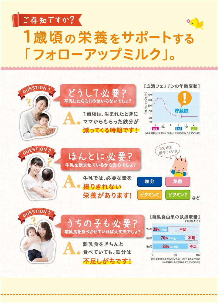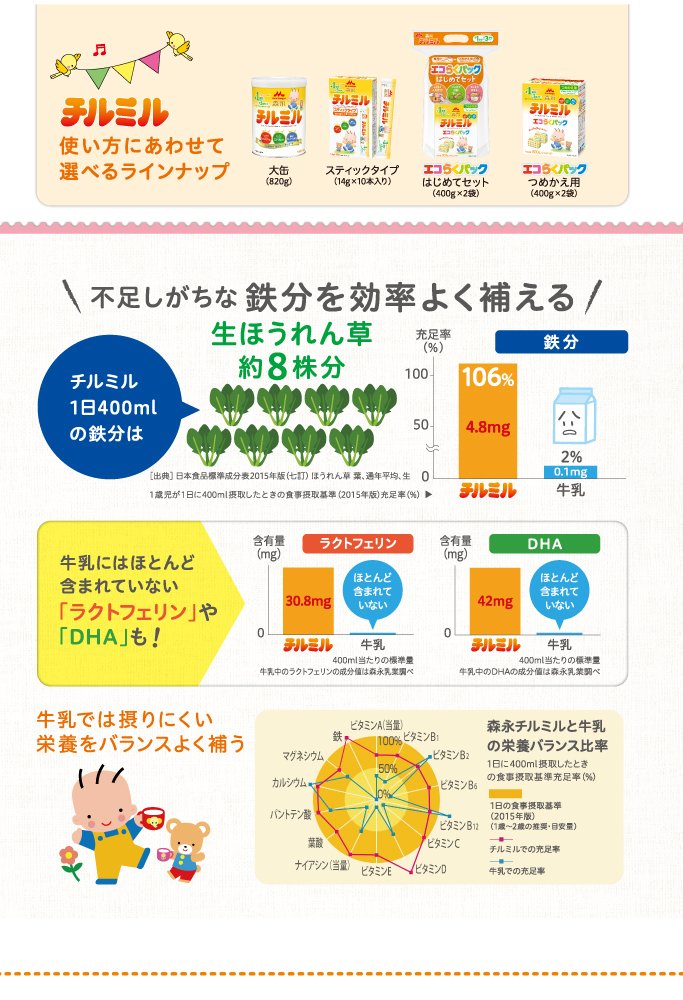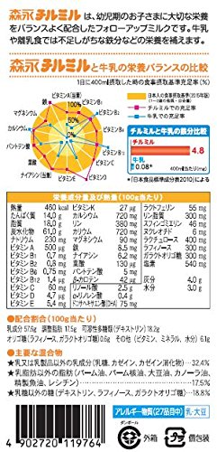 原材料:乳糖、デキストリン、調整脂肪(パーム油、パーム核油、大豆油、カノーラ油)、ホエイパウダー(乳清たんぱく質)、カゼイン、脱脂粉乳、たんぱく質濃縮ホエイパウダー、バターミルクパウダー、乳糖分解液(ラクチュロース)、ガラクトオリゴ糖液糖、精製魚油、ラフィノース、カゼイン消化物、炭酸カルシウム、塩化マグネシウム、リン酸三カルシウム、リン酸三カリウム、、レシチン、クエン酸三ナトリウム、塩化カルシウム、炭酸カリウム、リン酸水素二カリウム、ビタミンC、ラクトフェリン、塩化カリウム、ピロリン酸第二鉄、クエン酸、ビタミンE、ニコチン酸アミド、パントテン酸カルシウム、ビタミンD3、シチジル酸ナトリウム、イノシン酸ナトリウム、ビタミンA、グアニル酸ナトリウム、ビタミンB6、5'-アデニル酸、ビタミンB1、ビタミンB2、葉酸、β-カロテン、ビタミンB12