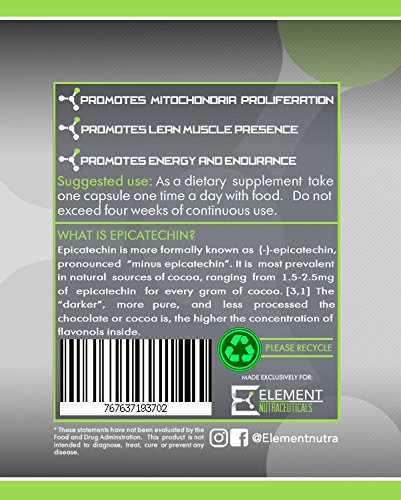 -. Binding : Health and Beauty -. Brand : Element Nutraceuticals -. EAN : 0767637194020 -. Feature : 1 Capsule = 1 Serving / 60 Servings per bottle **Compared to other brands that are 2 cap servings / 1 capsule Contains 300mg of (-)- Epicatechin per capsule, 200mg Green Tea Extract and 100mg Beetroot Extract / Improve recovery,Antioxdant Support, and may help in reducing body fat / Increases Aerobic metabolism, Strength, and Endurance / Reduces Myostatin levels and increases Follistatin -. IsAdultProduct : 0 -. Label : Element Nutraceuticals -. Manufacturer : Element Nutraceuticals -. MPN : ENEPI -. PackageQuantity : 1 -. PartNumber : ENEPI -. ProductGroup : Health and Beauty -. ProductTypeName : HEALTH_PERSONAL_CARE -. Publisher : Element Nutraceuticals -. Studio : Element Nutraceuticals -. Title : EPICATECHIN (60 servings x 300 mg per serving) by Element Nutraceuticals -. UPC : 767637194020