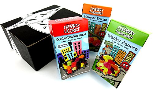-. Feature : Includes one 9.5 oz package of Gustaf's Monster Trucks Freeway Fruitgummies, one 9.5 oz package of Gustaf's Double Decker Duos Freeway Licorice, and one 9.5 oz package of Gustaf's Wacky Racers Freeway Fruitgummies / Gluten Free, All Natural, Fat Free / Product of the Netherlands / In a Black Tie Mercantile Signature™ Gift Box (Pictured)