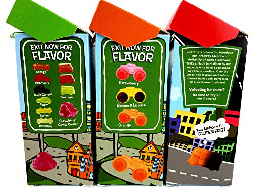 -. Title : Gustaf's Gluten Free Freeway Fruit & Licorice Candies 3-Flavor Variety: One 9.5 oz Package Each of Monster Trucks, Double Decker Duos, and Wacky Racers in a Gift Box