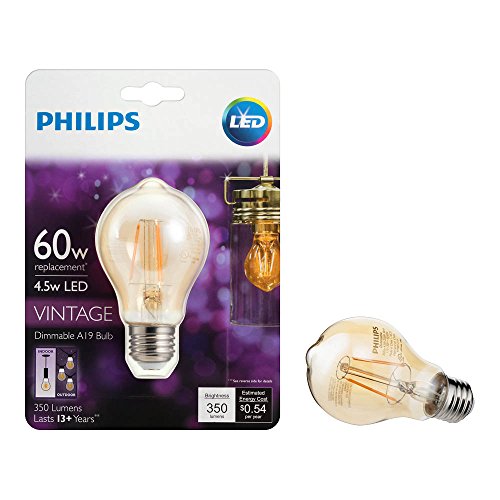 Philips A19 Vintage Filament LED light bulbs are made to be seen, with a classic, dimpled shape in amber glass and glowing filament that shines with 350 Lumen’s (60-Watt equivalent) warm light at a quarter of the energy use.