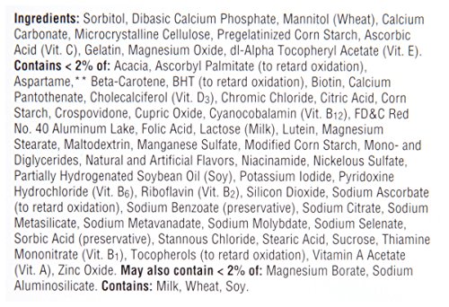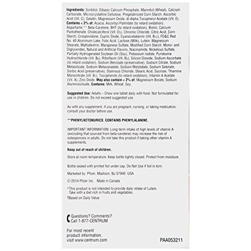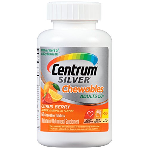 -. Binding : Health and Beauty -. Brand : Centrum -. Feature : Pack of three, 60 counts (total of 180 counts) / Age-adjusted multivitamin for people over 50 years / Helps protect health of heart, eyes and bones / Specially formulated with certain age-essential nutrients like Calcium, B Vitamins and antioxidants -. IsAdultProduct : 0 -. Label : Centrum Silver -. Manufacturer : Centrum Silver -. NumberOfItems : 3 -. PackageQuantity : 3 -. ProductGroup : Health and Beauty -. ProductTypeName : HEALTH_PERSONAL_CARE -. Publisher : Centrum Silver -. Studio : Centrum Silver -. Title : Centrum Silver Multivitamin/Multimineral Supplement Chewable Tablets for Adults 50+, Citrus Berry, 60 Count Bottles (Pack of 3) -. UPC : 300054461193