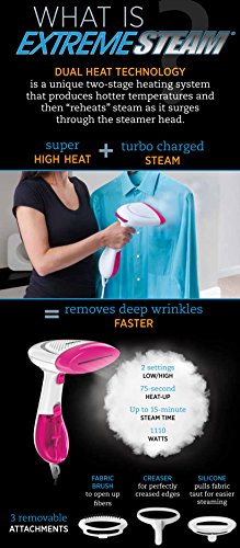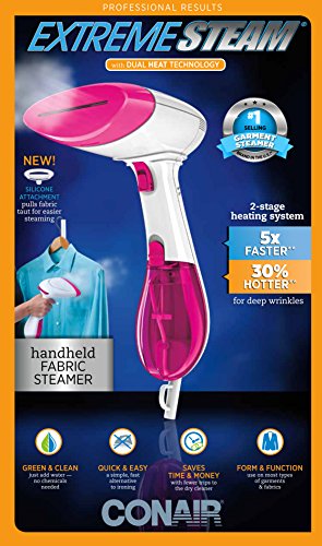 Studio : Conair Publisher : Conair Binding : Kitchen Product Description Introducing the conair extreme steam hand held fabric steamer with dual heat. Extreme steam dual heat technology creates concentrated steam, up to 30Percent hotter, to penetrate heavier fabrics and release wrinkles 5x faster than other steamers. It even kills dust mites bed bugs. Heating up in 75 seconds for 15 minutes of steam time, this must-have brings garments back to life. Two heat settings take care of a range of fabrics, like wool, cotton, silk, satin and more. It has a 1110-watt dual heater system and includes 3 removable attachments: fabric brush, Creaser, and soft cushion brush. It comes with a removable water tank and 9-foot power cord for safe and convenient movement. It also features steam trigger with built in switch for constant steam and energy-saving steam Pause. Limited one-year warranty. 0