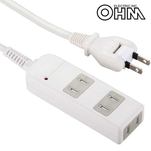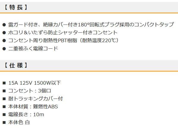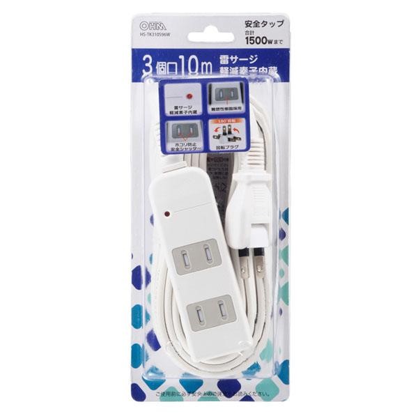 雷ガード・絶縁カバー付き!!180度回転式プラグ採用のコンパクトタップ。 生産国:中国 ※サプライヤー直送品 ご注文後3~4営業日後の出荷となります【商品名】OHM 雷ガード付タップ 3個口 10m 白 HS-TK310S96W