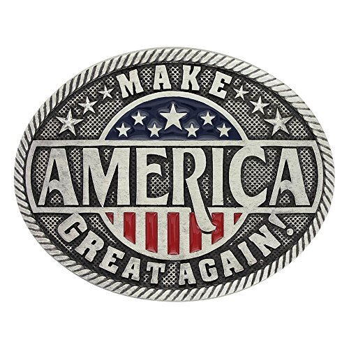 Binding : Apparel Product Description An oval antiqued silver tone Attitude buckle with the phrase 'Make America Great Again' across the front with emphasis on America. A design of a half moon of stars highlighted by deep blue paint rests above America while another half moon rest below with silver toned vertical bars alternated with brightly painted red ones giving the buckle a deep patriotic feel. The buckle is finished with a edge of rope design. Standard 1.5 inch belt swivel.
