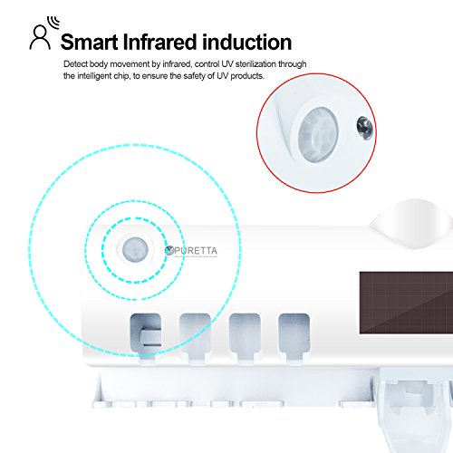 - ♥ Smart Infrared induction: It can detect body movement by infrared, and when a body is within 1 meter of the station, white and blue indicators on and will smartly postpone the sterilizing process, the real sterilization is 2 hours AFTER people leave to avoid UV light hurt