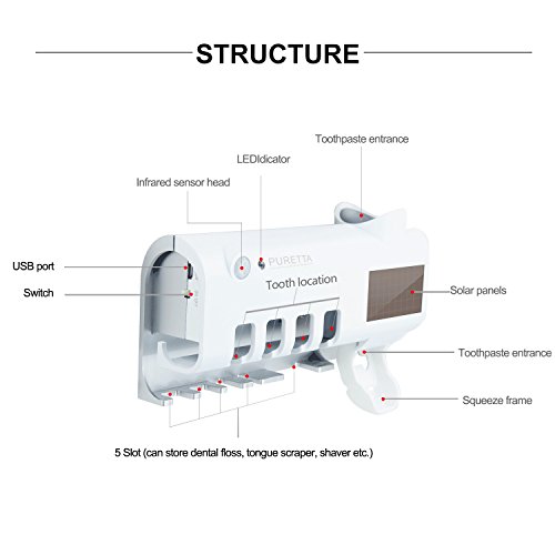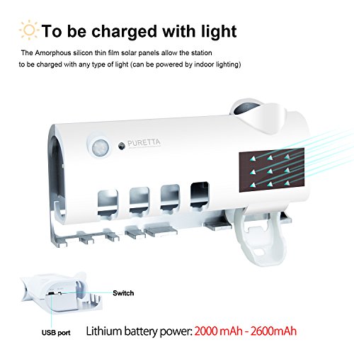 UV Toothbrush Sterilizer Sanitizer Toothbrush Holder Toothpaste Dispenser Wall Mounted Rechargeable Solar Power Toothbrush Holder with 3M Adhesive Kill Bacteria Germ for Women Baby in Bathroom(White)