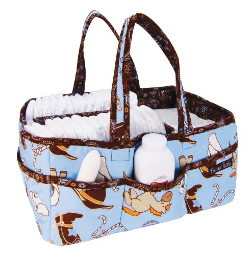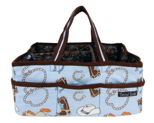 Add organization to any area of your home with this Cowboy Baby portable Storage Caddy. This lightly padded caddy features a cowboy themed scatter print in chocolate, dusk blue, cream and desert sand with touches of burnt orange and caramel on a powder blue background throughout the outside with a coordinating bandana print inside and is finished with a brown ultra suede trim. Caddy has 8 outer pockets and a removable “T” separator for maximum versatility. Keep diapers, wipes and other necessities tidy while traveling from room to room. Caddy also functions as an organizer for crafts, picnics, pet supplies, etc.