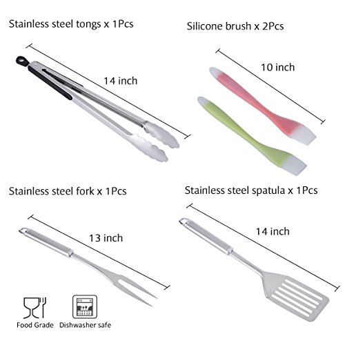 - Tool size : Tong 14 inch,fork 13 inch,spatula 14 inch,basting brush 10 inch.
