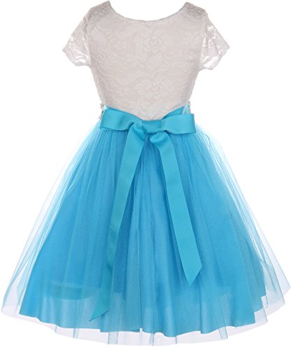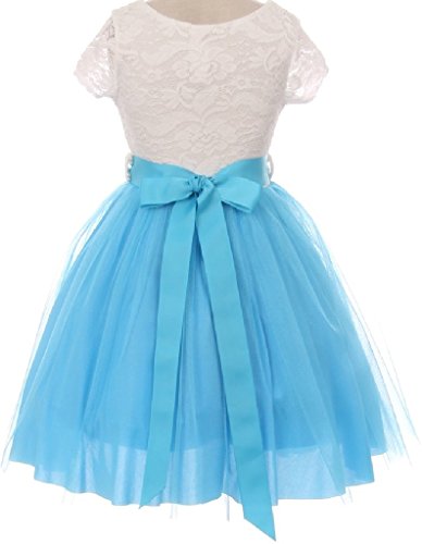 Gorgeous dress that complements the features of your special little girl! Cap Sleeve Lace Top Tulle Bottom Flower girls Dresses. Stone Rhinestone Belt on the waist. Zip up back and tie-back sash. Dress is tea length and fabulous! Perfect for flower girl, Junior Bridesmaid, Easter, Pageant, Graduation and other special occasions.Feature