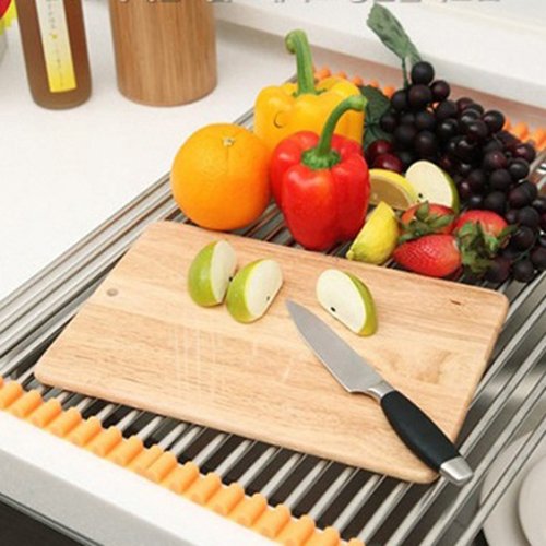 The mat sits nicely over the sink to help save space and make cleanup a breeze. Cut meats, fruits or vegetables on a cutting board. DRY your dishes without using up valuable counter space. Drain juices and water directly into your sink.